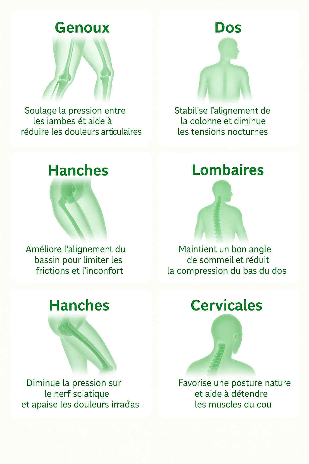 ✔ Genoux : soulage la pression entre les jambes et réduit les douleurs articulaires.